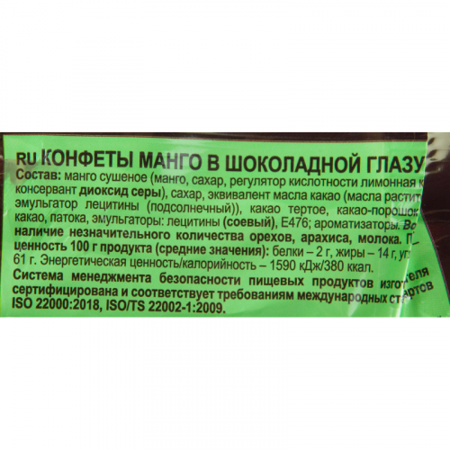 Конфеты с сухофруктами. Много начинки! - Кусочки вяленого манго. - Глазурь из отборных какао-бобов. Состав: манго сушеное (манго, сахар, регулятор кислотности лимонная кислота, консервант диоксид серы), сахар, эквивалент масла какао (масла растительные, эмульгатор лецитины (подсолнечный)), какао тертое, какао-порошок, масло какао, патока, эмульгаторы: лецитины (соевый), Е476; ароматизаторы. Возможно наличие незначительного количества орехов, арахиса, молока. Пищевая ценность на 100 г продукта: белки - 2 г, жиры - 14 г, углеводы - 61 г. Энергетическая ценность: 380 ккал. Срок годности: 6 месяцев. Условия хранения: хранить при температуре от 15 С до 21 С. Масса нетто: 500 г. Производитель: Озерский сувенир КК ООО. Страна производства: Россия.