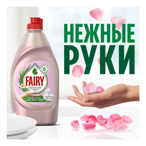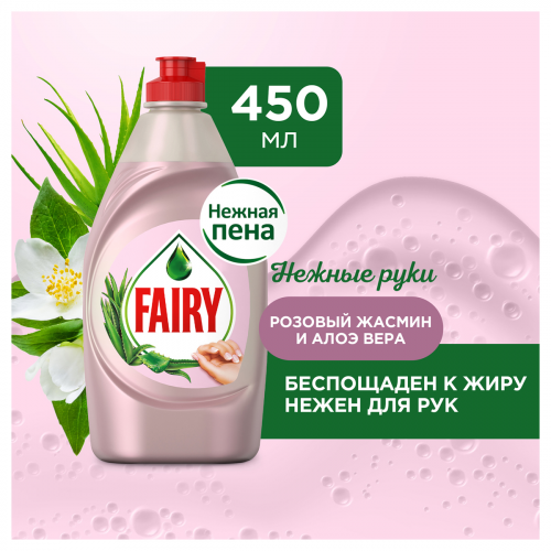 Fairy Нежные руки с ароматом розового жасмина и алоэ вера — эффективное моющее средство для посуды с формулой, против которой не устоят любые пищевые загрязнения. Молекулы средства глубоко проникают даже в застывший жир, расщепляя его изнутри и устраняя стойкие запахи. Эффект — чистая посуда без усилий даже при мытье в холодной воде. Средство обладает приятным расслабляющим ароматом. Имеет консистенцию геля, благодаря которой хорошо пенится и обеспечивает экономичный расход. Бережно относится к вашей коже. Формула геля Фейри безопасна для кожи рук, при этом безжалостна к пищевым загрязнениям. Концентрат на основе биоразлагаемых компонентов хорошо смывается водой. Особенности средства для мытья посуды Fairy: 1. КОНЦЕНТРИРОВАННАЯ ФОРМУЛА. Благодаря концентрированной формуле мгновенного расщепления жира посуда будет сиять; 2. ИДЕАЛЬНО ЧИСТАЯ ПОСУДА БЕЗ ЗАМАЧИВАНИЯ. Теперь ваша посуда не требует замачивания, так как активные компоненты Фейри работают даже в холодной воде и удаляют жир без остатка; 3. ЗАБОТА О КОЖЕ. Благодаря мягкой формуле концентрата вам не понадобится надевать защитные перчатки. Подходит для чувствительной кожи, сохраняя ее нежность; 4. ЭКОНОМИЧНЫЙ РАСХОД. За счет стойкой густой пены, одна капля Fairy отмоет в 2 раза больше посуды, чем более бюджетные средства из ассортимента P&G; 5. УНИВЕРСАЛЬНОСТЬ. Концентрат подходит для мытья посуды, а также овощей, фруктов и детских игрушек; 6. ЦВЕТОЧНЫЙ АРОМАТ. Fairy сделает повседневную задачу мытья посуды приятнее и наполнит кухню цветочным ароматом. Моющее средство Fairy очистит стойкие и сложные загрязнения с любой посуды — керамической, стеклянной, стальной, алюминиевой и другой, вытесняя даже въедливые запахи. Подходит для очищения сковороды, решетки для гриля и др. поверхностей. Без остатка смывается водой. После семейных обедов и домашних праздников вы легко отмоете все тарелки и приборы вместе с Fairy. Для мытья посуды просто добавьте каплю геля на влажную губку и нанесите на очищаемую поверхность. Добавляйте средство по мере необходимости в соответствии с количеством посуды, типом и степенью загрязнения. Геля для мытья посуды Fairy в бутылке объемом 450 мл хватит надолго. Материал пластиковой бутылки подлежит переработке.
