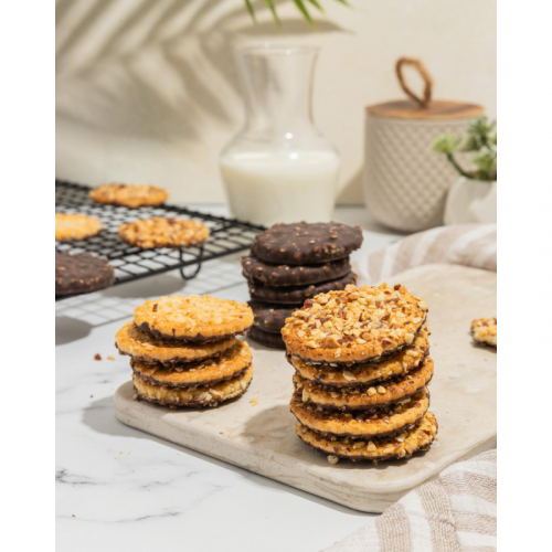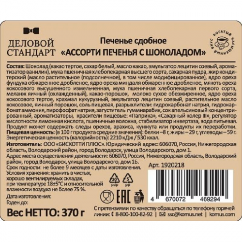 Печенье сдобное в глазури Деловой Стандарт ассорти с шоколадом 370 г Сдобное печенье "Деловой Стандарт" - ассорти из трёх видов нежного хрустящего печенья, декорированного дроблёными фундуком, миндалём и кокосовой стружкой. Донышко печенья покрывается натуральным шоколадом с бисквитной крошкой. Состав: Шоколад (какао тёртое, сахар белый, масло какао, эмульгатор лецитин соевый, ароматизатор ванилин), мука пшеничная хлебопекарная высшего сорта, сахарная пудра, жир кондитерский (масло растительное (подсолнечное), в том числе модифицированное), ядро ореха фундука обжаренное дроблёное, ядро ореха миндаля обжаренное дроблёное, мякоть ореха кокосового высушенного измельчённая, меланж яичный (охлаждённый), какао-порошок, молоко сухое обезжиренное, ядро ореха кокосового тёртое, крахмал кукурузный, эмульгатор лецитин соевый, растительное масло кокосовое, яичный порошок, соль пищевая, разрыхлители: гидрокарбонат натрия, гидрокарбонат аммония, пирофосфат натрия, загуститель гуммиарабик", сок апельсиновый концентрированный, ароматизаторы, красители пищевые: "Паприка", "Сахарный колер III", регулятор кислотности лимонная кислота, пшеничные волокна, стабилизатор инвертаза, вода питьевая. Продукт может содержать следы других орехов, арахиса, кунжута или продукты их переработки. Пищевая ценность в 100 г: белки - 8 г, жиры - 29 г, углеводы - 59 г. Энергетическая ценность (калорийность): 2210 кДж (530 ккал). Масса нетто: 370 г. Условия хранения: хранить в чистых, хорошо вентилируемых складах, при температуре (18+/-5) С и относительной влажности воздуха не более 75%. Срок годности: 9 месяцев. Страна производства: Россия.