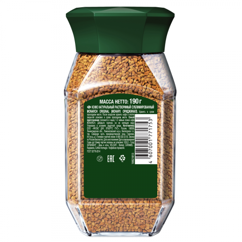 В благородной теплоте тщательно обжаренных зерен скрывается секрет подлинной крепости и притягательного аромата кофе Monarch. Заварите чашку кофе Monarch, и вы сразу почувствуете, как его уникальный притягательный аромат окружит вас и создаст особую атмосферу для теплого общения с вашими близкими. Так рождается неповторимая атмосфера Аромагии кофе Monarch.Растворимый сублимированный кофе Monarch всегда подойдет для встречи в узком кругу друзей или для большой компании. Стеклянная банка Monarch (190 г) -это яркая и оригинальная упаковка, и легко узнаваемая форма, сразу заметите ее на полке магази