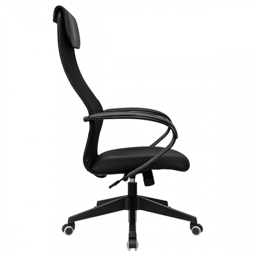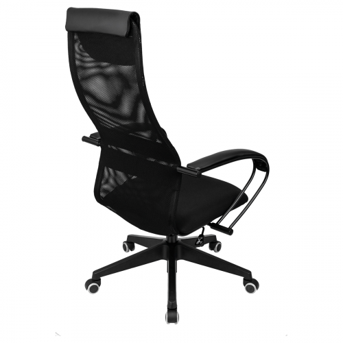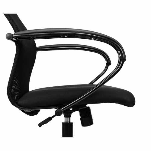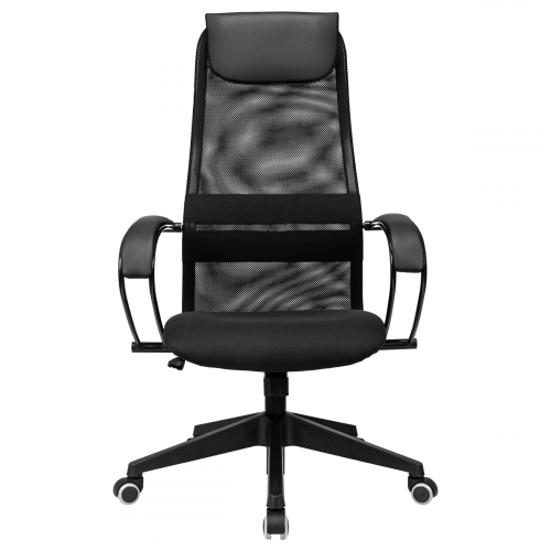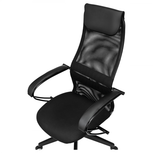Высокая «сетчатая» спинка с анатомичным изгибом обеспечивает идеальную поддержку, отличную вентиляцию и позволит сохранить чувство свежести в «жаркие» рабочие дни. Механизм качания с возможностью фиксации кресла в рабочем положении. Каркас – немонолитный, материал набивки – вспененный полиуретан, материал обивки сиденья – ткань черная, спинки – ткань-сетка черная с мягким подголовником из экокожи, подлокотники металлические крашеные, цвет черный, с накладками из экокожи., крестовина – пластик. Гарантийный срок – 24 месяца.