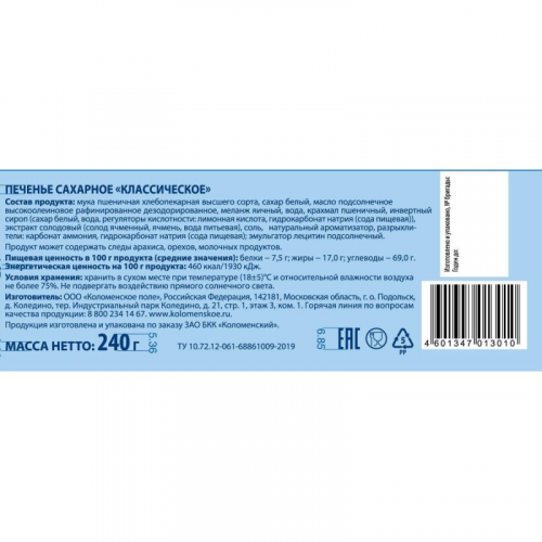 Печенье сахарное Коломенский классическое 240 г Печенье "Коломенское" классическое обладает богатым сливочно-карамельным вкусом. Нежное и хрустящее печенье "Коломенское" выпекается по особой итальянской технологии и обладает тающей во рту текстурой. Рецептуры печенья соответствуют современным трендам и обогащены полезными веществами. Печенье не содержит пальмового масла или маргарина на основе пальмового масла. Высокоолеиновое подсолнечное масло, на котором сделано печенье, при высоких температурах выпечки не образует транс-жиров, содержит природный антиоксидант витамин Е, Омега-3 и Омега-9. Вкус печенья максимально приближен к домашнему. Состав: мука пшеничная хлебопекарная высшего сорта, сахар белый, масло подсолнечное высокоолеиновое рафинированное дезодорированное, меланж яичный, инвертный сироп (сахар белый, вода, регуляторы кислотности: лимонная кислота, гидрокарбонат натрия (сода пищевая)), крахмал пшеничный, вода, экстракт солодовый (солод ячменный, ячмень, вода питьевая), соль, натуральный ароматизатор, разрыхлители: гидрокарбонат натрия (сода пищевая), карбонат аммония; эмульгатор - лецитин подсолнечный. Продукт может содержать следы арахиса, орехов, молочных продуктов. Пищевая ценность на 100 г: белки - 7,5 г; жиры - 16 г; углеводы - 70 г. Энергетическая ценность: 1910 кДж (450 ккал). ТУ 10.72.12-061-68861009-2019. Масса нетто: 240 г. Условия хранения: хранить в сухом месте при температуре (18 +/- 5) C и относительной влажности воздуха не более 75%. Не подвергать воздействию прямого солнечного света. Срок годности: 10 месяцев. Страна производства: Россия.