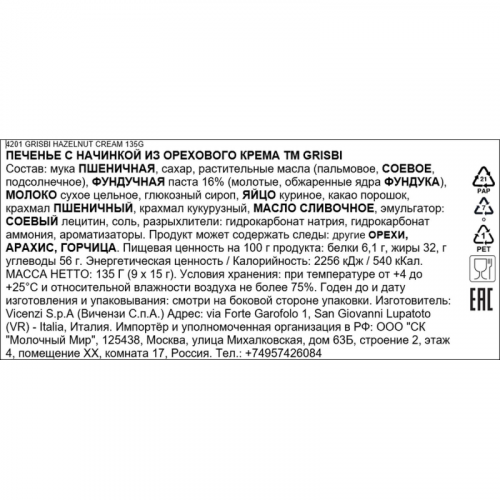 Печенье песочное Grisbi с ореховым кремом 135 г Благородный ореховый крем, хрустящее рассыпчатое печенье и много-много удовольствия от Grisbi! Попробуйте с кофе без молока, эспрессо или американо, чтобы оценить яркий ореховый вкус этого лакомства. Печенье Grisbi - выражение итальянского отношения к выпечке. Только лучшие ингредиенты, только проверенные рецепты, только восхитительный вкус! Больше, чем печенье: настоящее итальянское сокровище! Оболочка из песочного теста содержит нежный крем из фундука. Состав: мука пшеничная, сахар, растительные масла (пальмовое, соевое, подсолнечное), фундучная паста 16% (молотые, обжаренные ядра фундука), молоко сухое цельное, глюкозный сироп, яйцо куриное, какао порошок, крахмал пшеничный, крахмал кукурузный, масло сливочное, эмульгатор: соевый лецитин, соль, разрыхлители: гидрокарбонат натрия, гидрокарбонат аммония, ароматизаторы. Продукт может содержать следы: другие орехи, арахис, горчица. Пищевая ценность на 100 г: белки - 6,1 г, жиры - 32, г углеводы - 56 г. Энергетическая ценность: 2256 кДж (540 ккал). Сертификат соответствия ЕАС. Масса нетто: 135 г (9x15 г). Хранить при температуре от +4 до +25C и относительной влажности воздуха не более 75%.