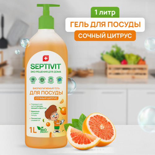Концентрированный биоразлагаемый гель для посуды SEPTIVIT Premium. Средство для мытья посуды Септивит - это экологичное средство, которое подходит для мытья посуды, овощей и фруктов. Эффективная формула тщательно отмывает загрязнения с посуды, легко устраняет жир и запахи даже в холодной воде. Средство обладает свежей, бодрящей отдушкой спелого, сочного апельсина.