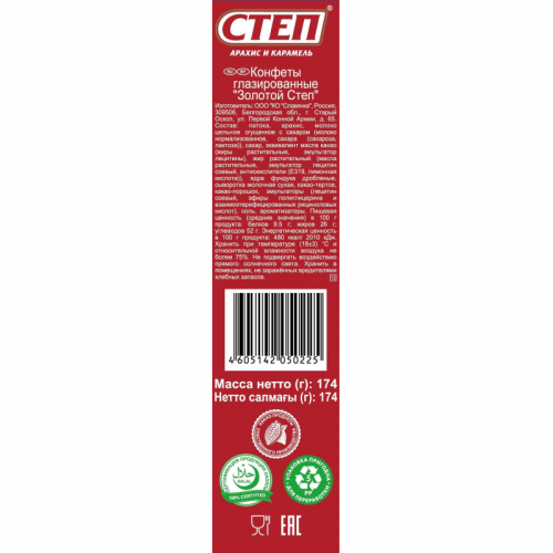 Конфеты шоколадные Степ Золотой с орехом 174 г. Конфеты на основе мягкой карамели с арахисом, покрытые великолепной молочной глазурью. Состав: патока, арахис, молоко цельное сгущенное с сахаром (молоко нормализованное, сахара (сахароза, лактоза)), сахар, эквивалент масла какао (жиры растительные, эмульгатор лецитины), жир растительный (масла растительные, эмульгатор лецитин соевый, антиокислители (Е319, лимонная кислота)), ядра фундука дробленые, сыворотка молочная сухая, какао-тертое, какао-порошок, эмульгаторы (лецитин соевый, эфиры полиглицерина и взаимоэтерифицированных рициноловых кислот), соль, ароматизаторы. Вес: 174 г. Пищевая ценность: жиры - 26 г, белки - 9,5 г, углеводы - 52 г. Энергетическая ценность: 480 ккал. Срок годности: 8 месяцев. Не подвергать воздействию прямого солнечного света. Хранить в помещениях, не зараженных вредителями хлебных запасов, при температуре от 18 до 22 С и относительной влажности воздуха не более 75%. Страна производства: Россия.