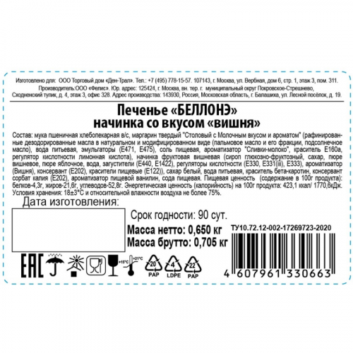 Печенье песочное Ден-Трал Беллонэ с вишнёвой начинкой 650 г Печенье "Беллонэ" с вишней - замечательная выпечка из мягкого песочного теста с насыщенной вишнёвой начинкой. Сладостью можно порадовать ребёнка, угостить дорогих друзей, сотрудников, знакомых во время душевного чаепития. Меры предосторожности - не подвергать воздействию прямых солнечных лучей. Состав: мука пшеничная хлебопекарная в/с, маргарин твёрдый "Столовый с молочным вкусом и ароматом" (рафинированные дезодорированные масла в натуральном и модифицированном виде (пальмовое масло и его фракции, подсолнечное масло), вода питьевая, эмульгаторы (Е471, Е475), соль пищевая, ароматизатор "Сливки-молоко", краситель Е160а, регулятор кислотности лимонная кислота), начинка фруктовая вишневая (сироп глюкозно-фруктозный, сахар, пюре вишневое, пюре яблочное, вода, загустители (E440, E1422), регуляторы кислотности (E330, E331(iii), E333), ароматизатор (Вишня), консервант (E202), красители пищевые (E122)), сахар белый, вода питьевая, краситель бета-каротин, консервант сорбат калия (E202), ароматизатор пищевой ванилин, сода пищевая. Пищевая ценность в 100 г: белков - 4,3 г, жиров - 21,6 г, углеводов - 52,8 г. Энергетическая ценность: 1770,6 кДж (423,1 ккал). ТУ 10.72.12-002-17269723-2020. Вес: 650 г. Условия хранения: (18+/-3) С и относительной влажности воздуха не более 75%. Срок годности: 3 месяца.