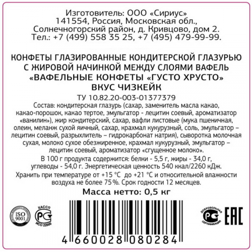 Конфеты ГустоХрусто Чизкейк вафельные 500 г. Состав: кондитерская глазурь (сахар-песок, заменитель масла какао ( пальмоядровое масло, эмульгаторы: лецитин соевый, сорбитан тристеарат), какао-порошок, эмульгатор - лецитин соевый, ароматизатор 'Ванилин'), вафли листовые (вода питьевая, мука пшеничная, фракция масла растительного - пальмовый олеин, соль, эмульгатор - лецитин соевый, разрыхлитель - гидрокарбонат натрия, регулятор кислотности - лимонная кислота), сахар, жир кондитерский (масло растительное - пальмовое масло, антиокислители: Е320, Е321), сыворотка молочная сухая, молоко сухое обезжиренное, эмульгатор - лецитин соевый, ароматизаторы: "Ванилин", "Чизкейк". Продукт может содержать следы кунжута, арахиса и орехов. Пищевая ценность 100 г продукта: белки - 5,5 г; жиры - 34,0 г; углеводы -54,0 г. Энергетическая ценность: 540 ккал/2260 кДж. Хранить при температуре от 15 до 21°С и относительной влажности воздуха не более 75%. Срок годности: 12 месяцев. Масса нетто: 500 г.