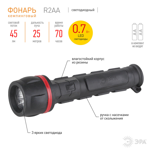 Фонарь ЭРА R2AA, благодаря универсальности, можно использовать в любой ситуации. 3 светодиода создают достаточный уровень освещенности. Рабочий режим обеспечивается всего 2 батарейками типа АА.