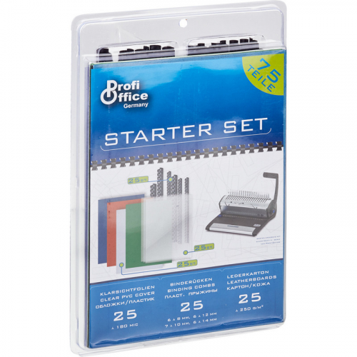 Стартовый набор для переплета ProfiOffice. При помощи одного такого набора вы сможете подготовить 25 различных брошюр. В его состав входят: обложки пластиковые прозрачные 25 шт., обложки картонные плотностью 230 г/кв.м с тиснением под кожу, различных цветов: белые, черные, красные, синие, зеленые (по 5 шт. каждого цвета). А также пружины пластиковые черного цвета, различных диаметров: 8 мм - 6 шт., 10 мм - 7 шт., 12 мм - 6 шт., 14 мм - 6 шт.