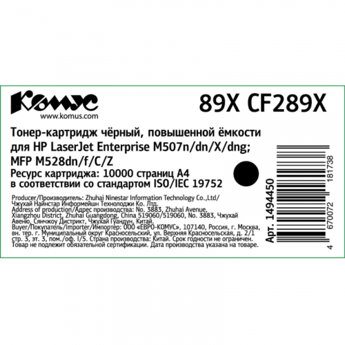 Картридж лазерный Комус 89X CF289X для HP черный совместимый повышенной емкостиВнимание! Перед установкой, картридж необходимо несколько раз встряхнуть.Внешний вид и/или характеристики товара могут быть изменены производителем в соответствии с производственным процессом.