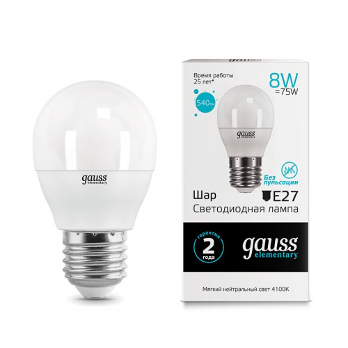Лампа светодиодная Gauss LED Elementary G 8Вт E27 4100К 540Лм 220В 53228.Светодиодная лампа формы шара Gauss (матовая), излучает естественный белый свет, с цоколем E27, мощность 8 Вт. Вечная классика, которая является энергосберегающей заменой обычным лампам накаливания. Обеспечивает пространство мягким, не мерцающим светом. Равномерное распределение света создаёт зрительный комфорт в любом помещении. Данная серия ламп создана для массового потребителя и имеет лучшее соотношение цены и качества. Серия модели Gauss Elementary.Преимущества изделия:- Срок службы: 25 000 часов.- Степень защиты IP20.- Низкая энергозатратность.- Устойчива к перепадам напряжения.- Отсутствие мерцательного эффекта.Характеристики изделий:- Коэффициент цветопередачи Ra: 80-89.- Световой поток: 540 Лм.- Цветовая температура: 4100 К.Основные габариты (мм):- Длина: 82 мм.- Диаметр: 45 мм.Области применения:- Бытовое освещение.- Коммерческое освещение.- Наружное освещение.Внешний вид и/или характеристики товара могут быть изменены производителем в соответствии с производственным процессом.