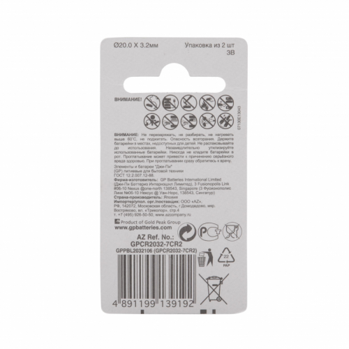 Батарейка CR2032 GP Lithium (2 штуки в упаковке) Внешний вид и/или характеристики товара могут быть изменены производителем в соответствии с производственным процессом.