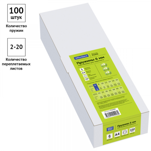 Пластиковые пружины OfficeSpace прозрачного цвета диаметром 6мм предназначены для переплета документов. Легко выдерживают многократное раскрытие при необходимости добавить или удалить листы из готовой брошюры. Рекомендуемый объем брошюры при использовании данного диаметра пружины: 2-20 листов.