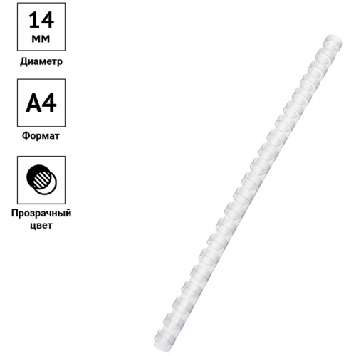 Пластиковые пружины OfficeSpace прозрачного цвета диаметром 14мм предназначены для переплета документов. Легко выдерживают многократное раскрытие при необходимости добавить или удалить листы из готовой брошюры. Рекомендуемый объем брошюры при использовании данного диаметра пружины: 81-100 листов.