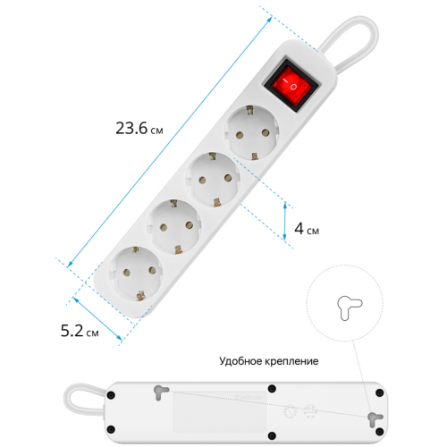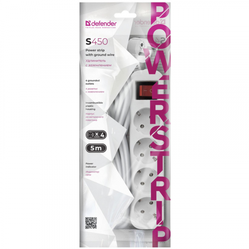 Удлинитель Defender S450, 4 розетки, с заземлением, выключатель, 5м, белый