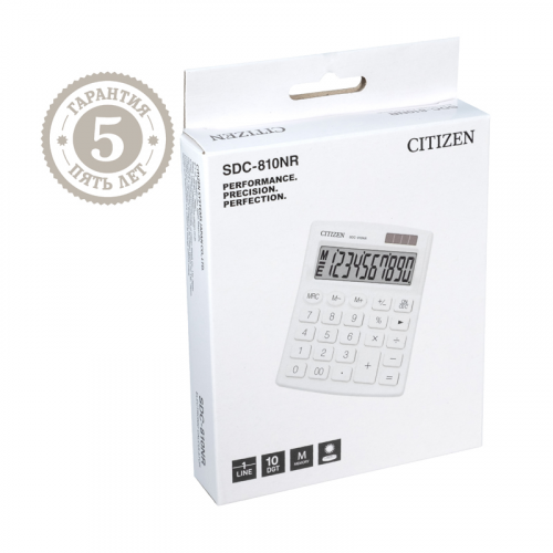 10-ти разрядный настольный калькулятор Citizen SDC-810NR- WH предназначен для выполнения арифметических операций. Оптимальный набор функций поможет автоматизировать расчёты: функция смены знака, коррекция последнего введенного значения. Двойное питание (солнечная батарея + батарея GP189(LR54)) и автоматическое отключение увеличивают срок службы. Размер калькулятора – 102*124*25 мм, вес – 94 г, цвет – белый. Упакован в картонную коробку. Гарантия 5 лет.
