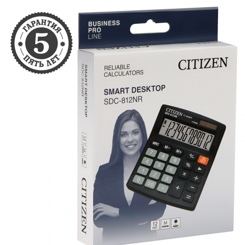 12-ти разрядный настольный калькулятор Citizen SDC-812NR предназначен для выполнения арифметических операций. Оптимальный набор функций поможет автоматизировать расчёты: функция смены знака, коррекция последнего введенного значения, кнопка «00». Двойное питание (солнечная батарея + батарея GP189(LR54)) и автоматическое отключение увеличивают срок службы. Размер калькулятора – 102*124*25 мм, вес – 94 г, цвет – чёрный. Упакован в картонную коробку. Гарантия 5 лет. • Разрядность: 12; • Тип питания – двойное (солнечная батарея/батарейка GP189(LR54)); • Клавиша «00»; • Подходит для ЕГЭ.