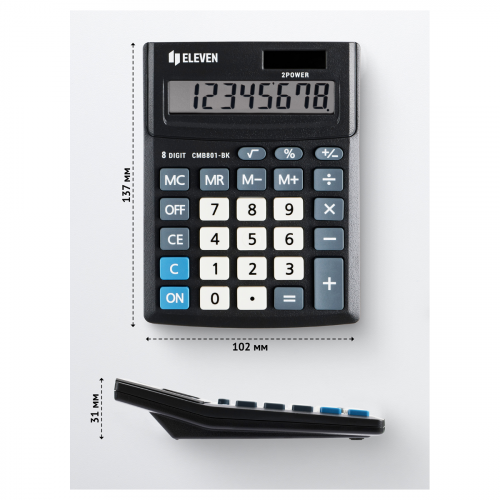 8-ми разрядный настольный калькулятор Eleven CMB801-BK – незаменимый помощник в офисе, школе и дома. Базовый набор функций поможет автоматизировать расчёты: вычислить квадратный корень, провести операции с процентами. Компактный размер поможет оптимизировать место на рабочем столе. Двойное питание (солнечная батарея + батарейка AG10(LR1130)) и автоматическое отключение увеличивают срок службы. Упакован в картонную коробку. Размер калькулятора – 102*137*31 мм, вес – 91 г, цвет – чёрный. Гарантия 5 лет. Настольный калькулятор – незаменимый помощник в офисе, школе и дома.