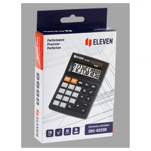 10-ти разрядные малый настольный калькулятор Eleven SDC-022SR– простое и компактное устройство, предназначенное для быстрых элементарных расчётов. Выполняет набор самых необходимых вычислений, в том числе операции с квадратным корнем и процентами. Двойное питание (солнечная батарея + батарея AG10(LR1130)) и автоматическое отключение увеличивают срок службы. Размер калькулятора –88*127*23 мм, вес – 66 г, цвет – чёрный. Гарантия 5 лет.