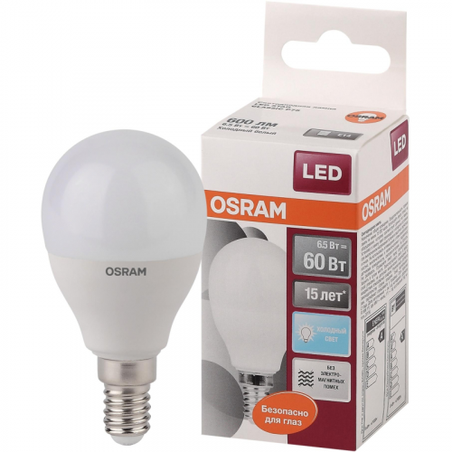 Лампа светодиодная Osram 6.5 Вт Е14 (Р, 4000 К, 600 Лм, 220 В, 4058075695955).Лампа с цоколем E14 имеет мощность 6.5 Вт и обеспечивает белое свечение с цветовой температурой 4000 К. Тип колбы у неё P, а световой поток составляет 600 лм. Лампа оснащена матовым рассеивателем и эквивалентна по мощности лампе накаливания на 60 Вт. Срок службы лампы составляет 25000 часов. Длина лампы - 77 мм, и она не оборудована филаментом. Индекс цветопередачи лампы превышает 80%, а угол светового пучка равен 180. Лампа рассчитана на напряжение в 220 В.Внешний вид и/или характеристики товара могут быть изменены производителем в соответствии с производственным процессом.