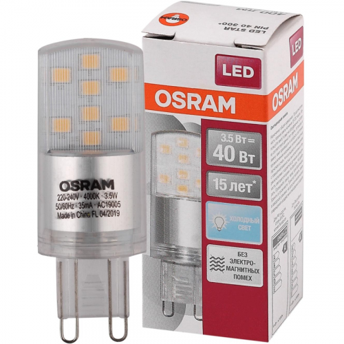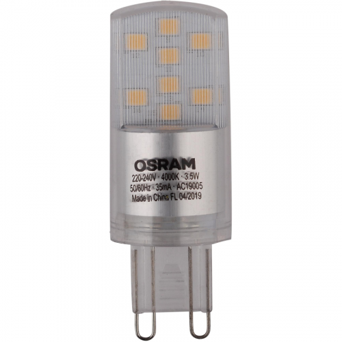 Лампа светодиодная Osram 3.5 Вт G9 (PIN, 4000 К, 400 Лм, 220 В, 4058075315853).Лампа с цоколем G9 имеет мощность 3.5 Вт и обеспечивает белое свечение с цветовой температурой 4000 К. Тип колбы у неё PIN, а световой поток составляет 400 лм. Лампа оснащена прозрачным рассеивателем и эквивалентна по мощности лампе накаливания на 40 Вт. Срок службы лампы составляет 15000 часов. Длина лампы - 57 мм, и она не оборудована филаментом. Индекс цветопередачи лампы превышает 80%, а угол светового пучка равен 300. Лампа рассчитана на напряжение в 220 В.Внешний вид и/или характеристики товара могут быть изменены производителем в соответствии с производственным процессом.