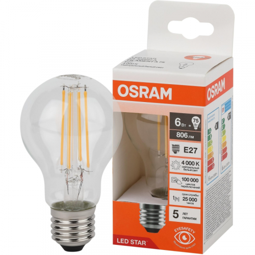 Лампа светодиодная Osram 6 Вт Е27 (А, 4000 К, 806 Лм, 220 В, 4058075684096).Лампа с цоколем E27 имеет мощность 6 Вт и обеспечивает белое свечение с цветовой температурой 4000 К. Тип колбы у неё A, а световой поток составляет 806 лм. Лампа оснащена прозрачным рассеивателем и эквивалентна по мощности лампе накаливания на 75 Вт. Срок службы лампы составляет 25000 часов. Длина лампы - 105 мм, и она оборудована филаментом. Индекс цветопередачи лампы превышает 80%, а угол светового пучка равен 300. Лампа рассчитана на напряжение в 220 В.Внешний вид и/или характеристики товара могут быть изменены производителем в соответствии с производственным процессом.