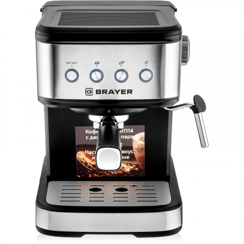 Кофеварка рожковая Brayer BR1114 Рожковая кофеварка Brayer BR1114 поможет создать ароматный вкусный кофе. С ней Вы сможете приготовить дома эспрессо, капучино или латте, так как ее мощность составляет 1 100 Вт и давление в помпе - 20 бар. Размер съемного резервуара для воды - 1,2 л. Вам не нужно постоянно пополнять его, так как такого объема хватит на большое количество чашек кофе. Кофеварка позволяет готовить две чашки кофе одновременно. Внешний вид и/или характеристики товара могут быть изменены производителем в соответствии с производственным процессом.
