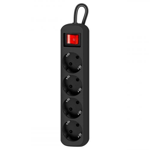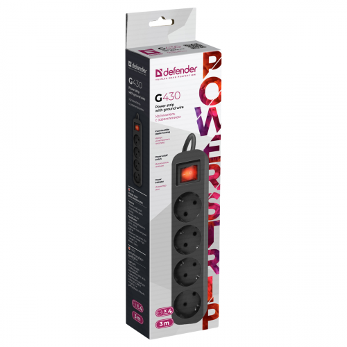 Удлинитель Defender G430, 4 розетки, с заземлением, выключатель, 3м, черный