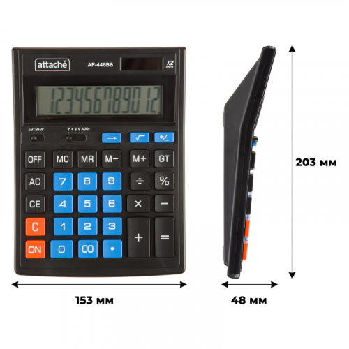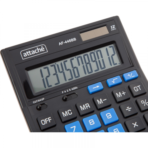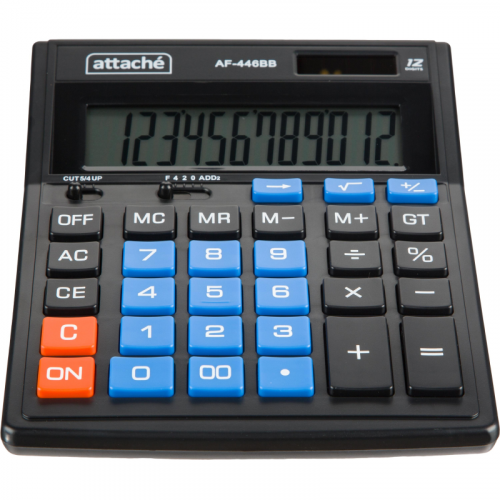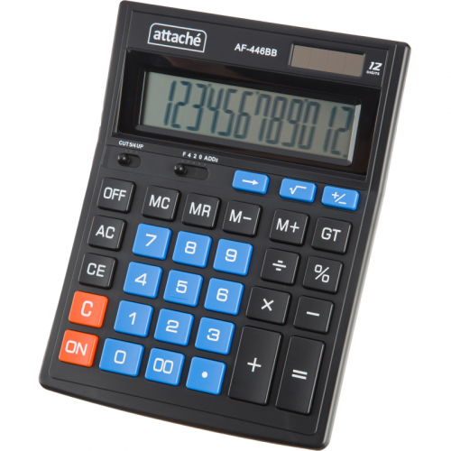 Калькулятор Attache полноразмерный настольный AF-446BB настольный с 12-разрядным ЖК-дисплеем. Эргономичная форма панели и крупные клавиши создают максимальный комфорт в использовании. Корпус изготовлен в черном цвете с кнопками синего цвета. Оптимальный и необходимый набор функций, среди которых: независимая память, MC, MR, M+, M-, GT, расчет процентов, округление. Функция вычисления налога: нет. Функция коррекции вычислений: нет. Пересчет курса валюты: нет. Наклонный дисплей: фиксированный. Большой двенадцатиразрядный дисплей отображает большие значения с высокой точностью округления. В калькуляторе имеется два источника питания: батарейка типа LR44 (входит в комплект) и солнечная батарея. Размер калькулятора: 203x153x48 мм. Материал корпуса и клавиатуры: пластик. Вес: 0.2 кг. Число строк дисплея: 1. Цвет: черный. Гарантийный срок: 12 мес.