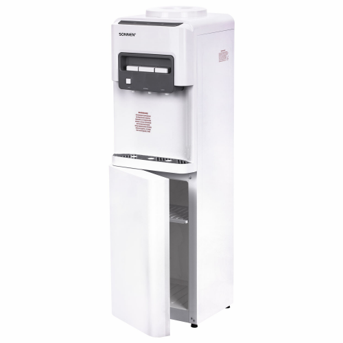 Вода нагревается с помощью ТЭНа мощностью 500 Вт, что позволяет достичь температуры 95 °С за считаные минуты. Компрессорное охлаждение мощностью 85 Вт обеспечивает поддержание температуры холодной воды на уровне 10 °С. Кулер предназначен для напольного размещения и имеет 3 крана типа "клавиша" для подачи горячей, холодной и воды комнатной температуры.