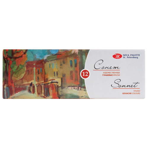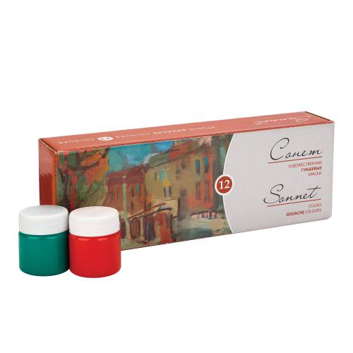 Художественная гуашь «Сонет» обладает высокой кроющей способностью. Выполнена на основе натурального связующего вещества, обеспечивающего высокую пластичность и устойчивость на любой поверхности (бумага, дерево, картон, стекло).