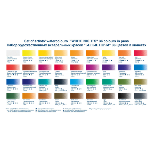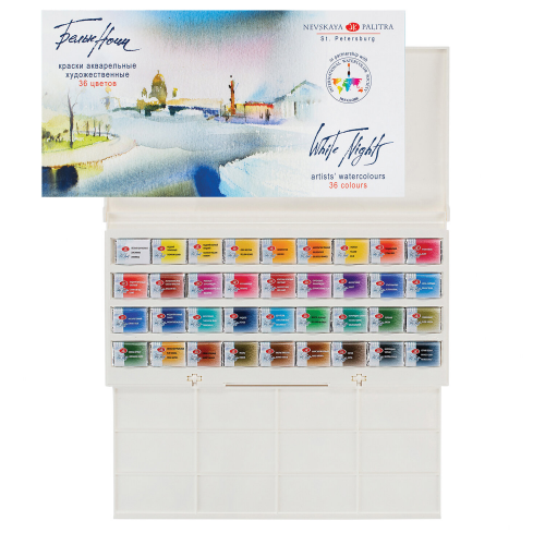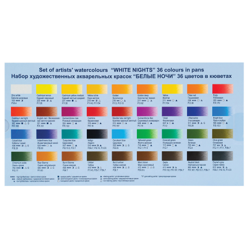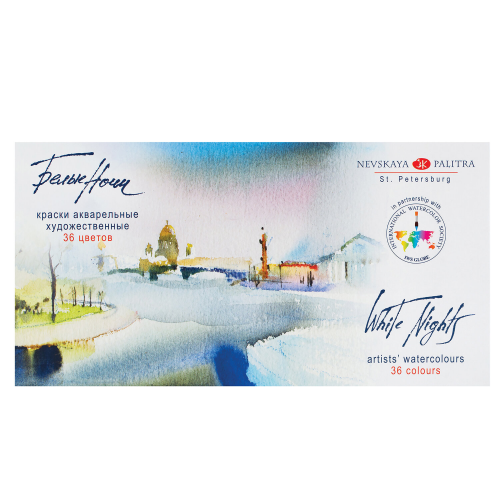 "Белые Ночи" - художественные акварельные краски отличного качества, объединяют традиции старейших мастеров и современные технологии. Тонкодисперсные суспензии пигментов в связующем с гуммиарабиком. Краски яркие, имеют чистый цвет, высокую светостойкость.