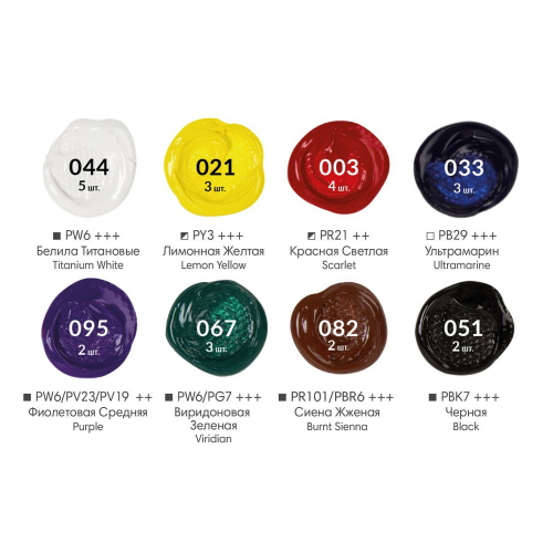 Упаковка: картонная коробка Количество цветов в наборе: 8 Серия: Debut Тип фасовки: туба Объем: 75 мл Спецэффект цвета: матовый Цвет: белила титановые (044), виридоновый зеленый (067), красная светлая (003), лимонная желтая (021), сиена жженая (082), ультрамарин (033), фиолетовый средний (095), черный (051) Тип краски: акриловые художественные