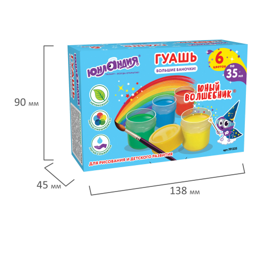 Гуашь ЮНЛАНДИЯ "ЮНЫЙ ВОЛШЕБНИК", 6 цветов по 35 мл, БОЛЬШИЕ БАНОЧКИ, высшее качество, без кисти, 191335