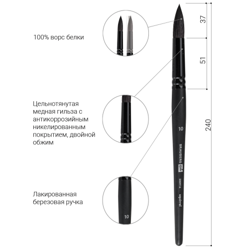 Кисть художественная проф. BRAUBERG ART CLASSIC, белка, круглая, № 10, короткая ручка, 200916