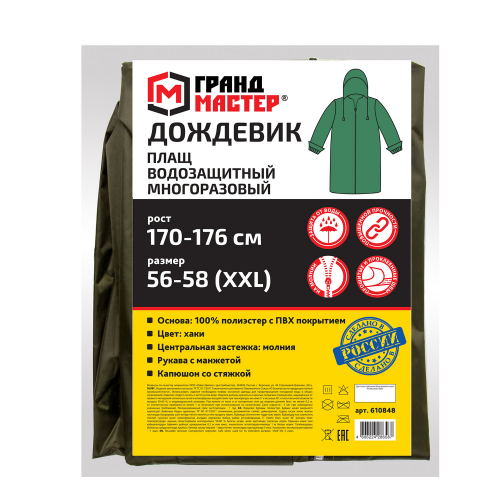 Многоразовый плащ-дождевик цвета хаки на молнии с ПВХ-покрытием ГРАНДМАСТЕР предназначен для защиты от ветра, дождя и других атмосферных воздействий. Идеально подойдет для работы на улице, отдыха на природе, рыбалки, пикника и городских прогулок.