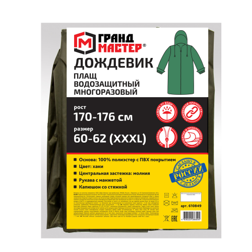 Многоразовый плащ-дождевик цвета хаки на молнии с ПВХ-покрытием ГРАНДМАСТЕР предназначен для защиты от ветра, дождя и других атмосферных воздействий. Идеально подойдет для работы на улице, отдыха на природе, рыбалки, пикника и городских прогулок.