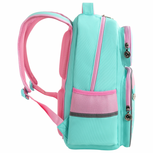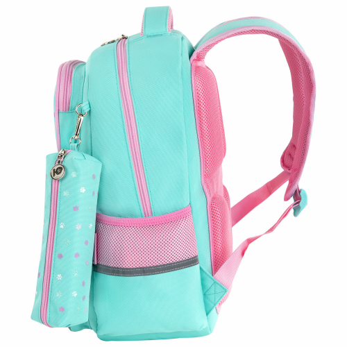 Рюкзак с формоустойчивой вентилируемой спинкой имеет 1 вместительное отделение на молнии и 5 карманов. Оптимальный размер рюкзака позволяет вместить все необходимые школьные принадлежности. Мягкие широкие регулируемые лямки способствуют оптимальному распределению веса.