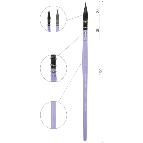 Кисти изготовлены с применением высококачественной синтетики. Отличаются универсальностью в использовании, обусловленной упругостью ворса и прекрасными впитывающими свойствами пучка. Короткая ручка из древесины покрыта лаком, что защищает ее от воздействия красок и влаги. Форма пучка - круглая № 6. Номер кисти соответствует реальной ширине пучка в миллиметрах. Упаковка - ОПП-пакет с европодвесом и картонной подложкой.