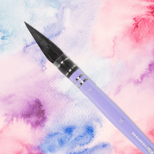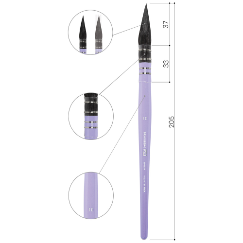 Кисти изготовлены с применением синтетики и белки. Отличаются универсальностью в использовании, обусловленной упругостью ворса и прекрасными впитывающими свойствами пучка. Короткая ручка из древесины покрыта лаком, что защищает ее от воздействия красок и влаги. Форма пучка - круглая № 10. Номер кисти соответствует реальной ширине пучка в миллиметрах. Упаковка - ОПП-пакет с европодвесом и картонной подложкой.