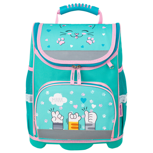 Жесткокаркасный ранец выполнен из прочного износостойкого полиэстера. Ранец состоит из одного просторного отделения, 1 переднего и 2 боковых карманов.