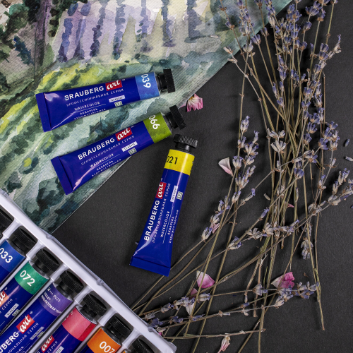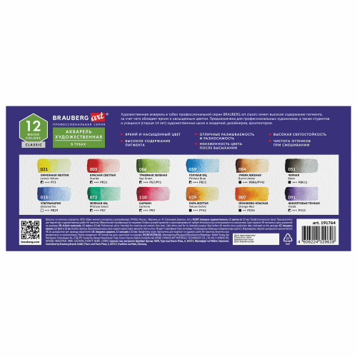 Акварельные краски созданы из высококачественных пигментов и гуммиарабика, без добавления примесей, что обеспечивает чистоту и насыщенность каждого цвета, а также получаемых при смешивании оттенков. Краски обладают отличной размываемостью и разносимостью, сохраняют оттенки после высыхания, высокоустойчивы к воздействию солнечного света.