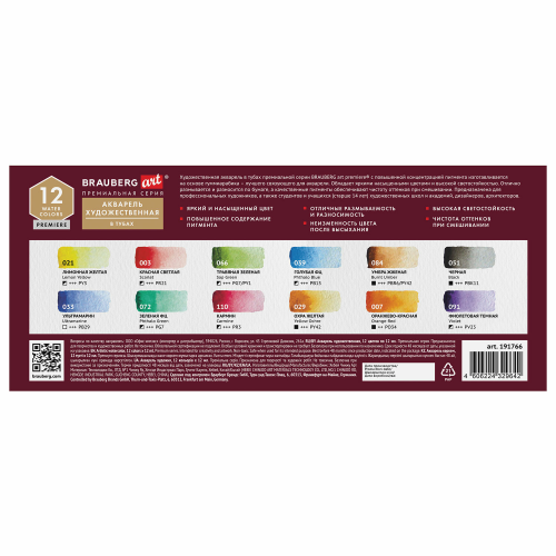 Акварельные краски созданы из высококачественных пигментов и гуммиарабика, без добавления примесей, что обеспечивает чистоту и насыщенность каждого цвета, а также получаемых при смешивании оттенков. Краски обладают отличной размываемостью и разносимостью, сохраняют оттенки после высыхания, высокоустойчивы к воздействию солнечного света.