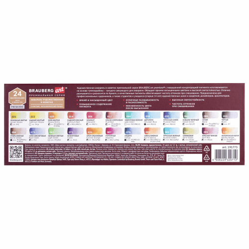 Акварельные краски созданы из высококачественных пигментов и гуммиарабика, без добавления примесей, что обеспечивает чистоту и насыщенность каждого цвета, а также получаемых при смешивании оттенков. Краски обладают отличной размываемостью и разносимостью, сохраняют оттенки после высыхания, высокоустойчивы к воздействию солнечного света.