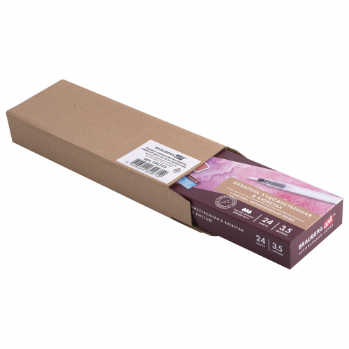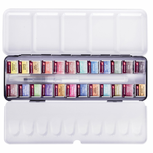 Акварель в кюветах поставляется в металлическом пенале с палитрой, кисть с резервуаром в комплекте.