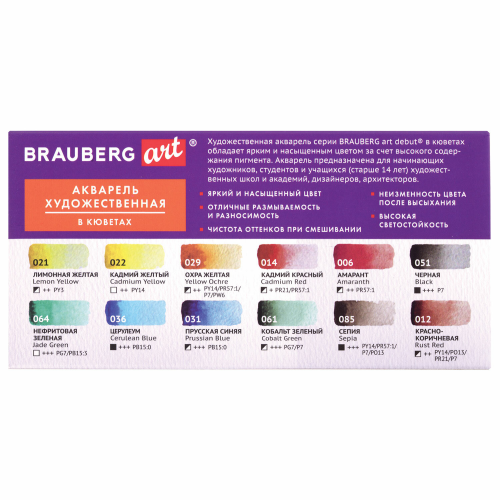 Акварельные краски созданы из высококачественных пигментов и гуммиарабика, без добавления примесей, что обеспечивает чистоту и насыщенность каждого цвета, а также получаемых при смешивании оттенков. Краски обладают отличной размываемостью и разносимостью, сохраняют оттенки после высыхания, высокоустойчивы к воздействию солнечного света.