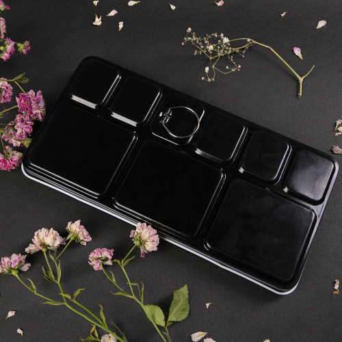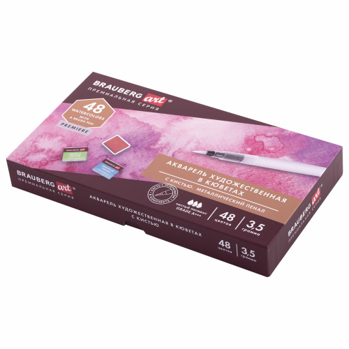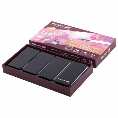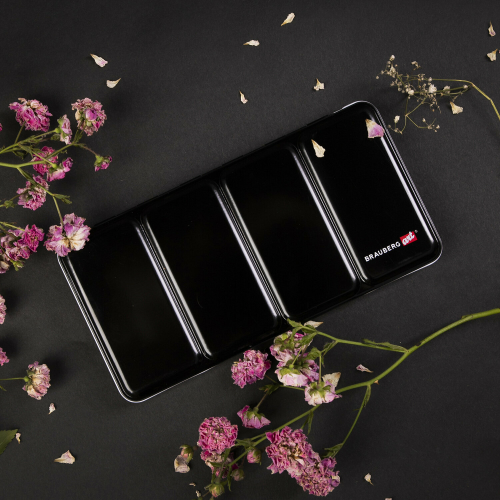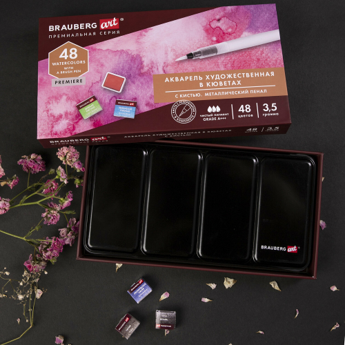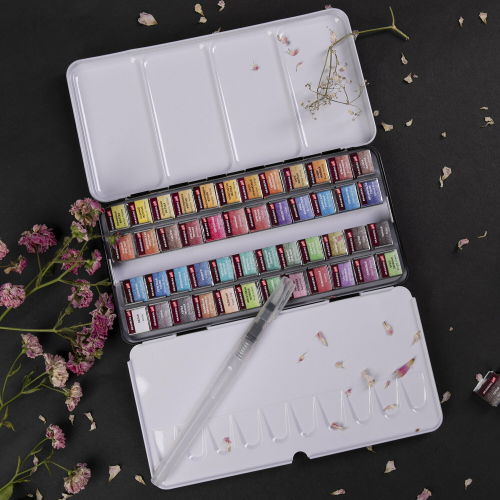 Акварель в кюветах поставляется в металлическом пенале с палитрой, кисть с резервуаром в комплекте.