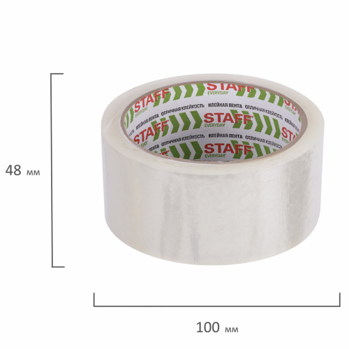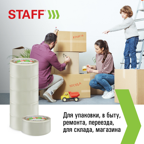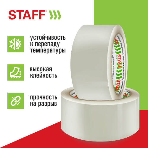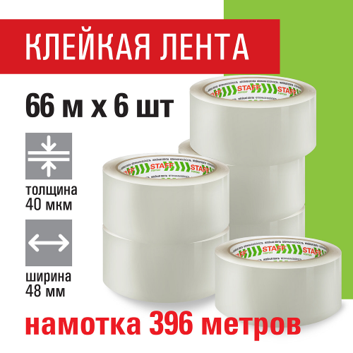 Толщина скотча 40 мкм позволяет переносить воздействие низких температур и влажности и выдерживать вес коробки 15-17 кг. Клейкой ленты шириной 48 мм и длиной намотки 66 м хватит на продолжительное время. Цвет - прозрачный.