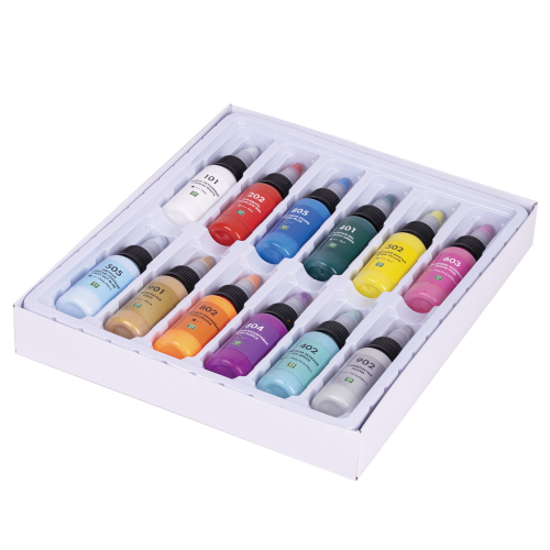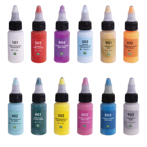 Краски во флаконах объемом 22 мл с удобным дозировочным клапаном поставляются в картонной коробке.