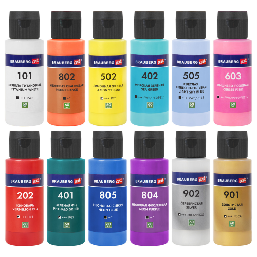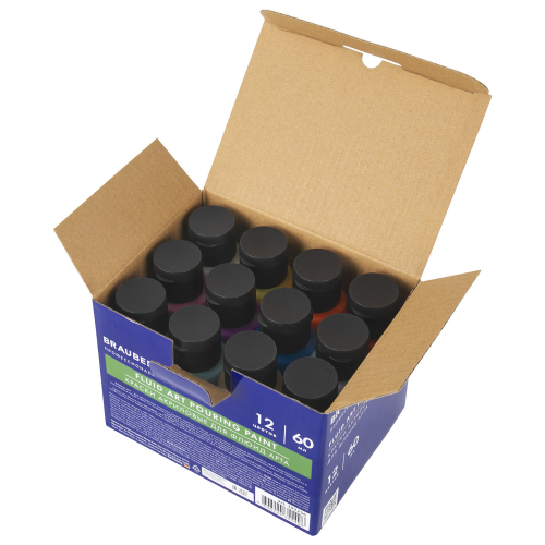 Краски во флаконах объемом 60 мл с удобным дозировочным клапаном поставляются в картонной коробке.